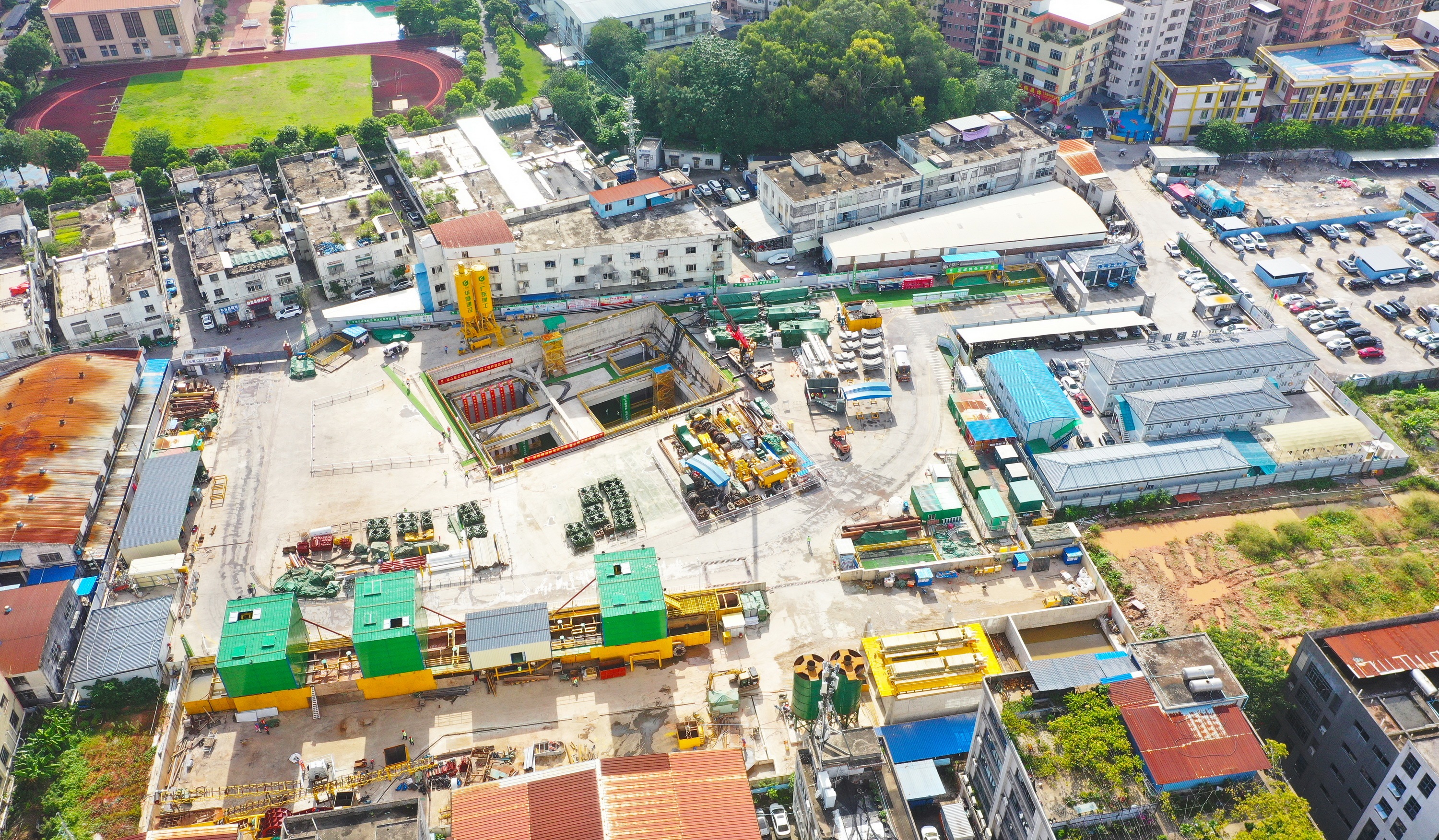 面对场地制约,广州地铁联合广东华隧、广东建科、广东重工院等参建方召开多场方案协调会金来源,最终采取分体始发的方式进行盾构始发。但分体始发管线连接复杂、同步控制精度要求高、风险大,给建设者带来重重困难。同时,狭窄的场地内,材料堆放、设备组装、车辆周转空间紧张,既要满足盾构机本体下井组装,又要合理布局地面后配套系统,更使分体始发难上加难。